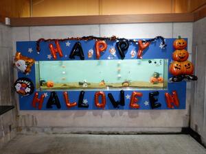 イトヨが泳ぐ大水槽をデコレーションしました。ハロウィン気分でイトヨ観察を楽しめます。写真撮影もできます。