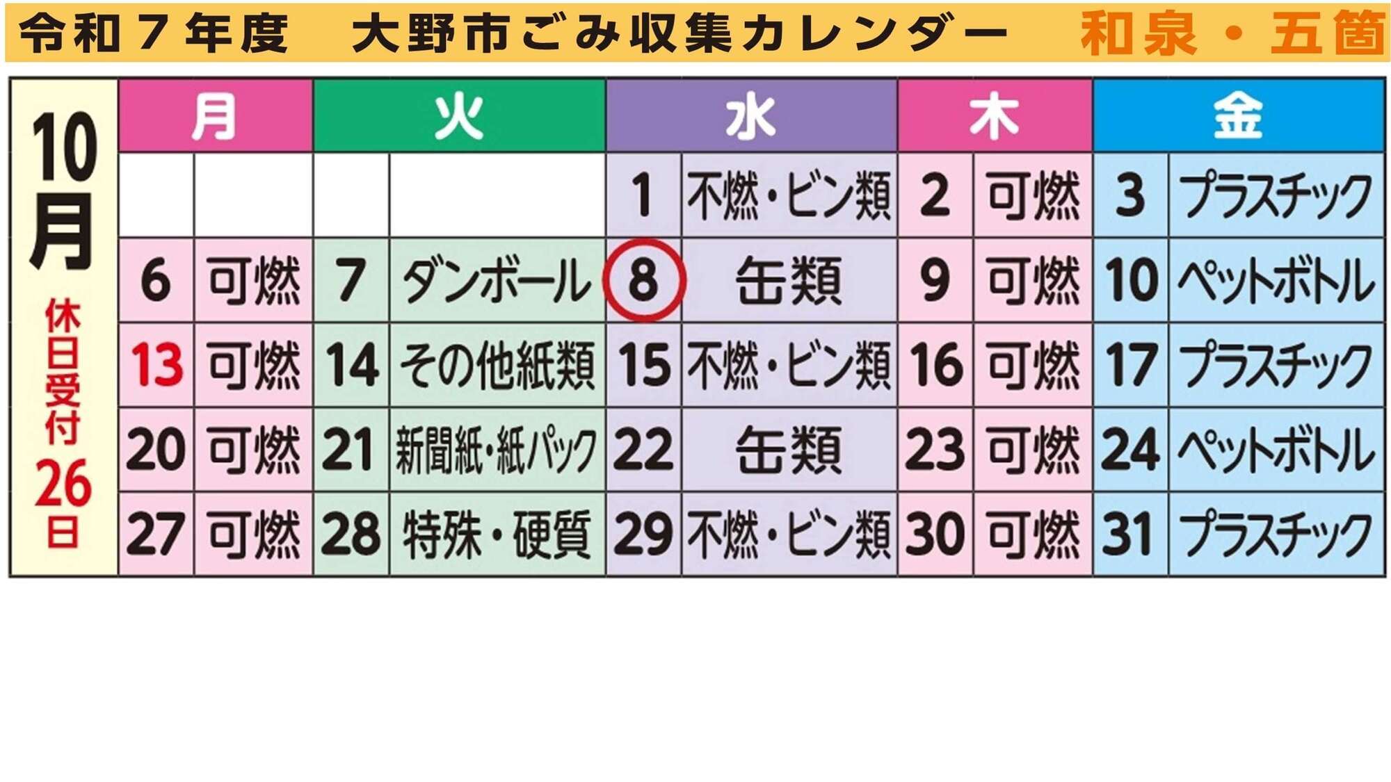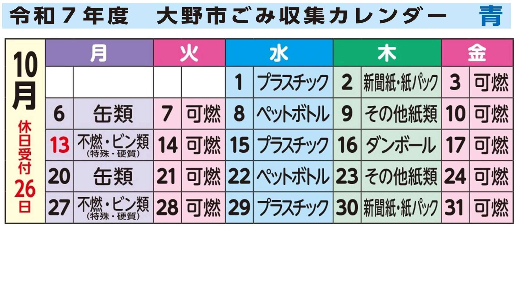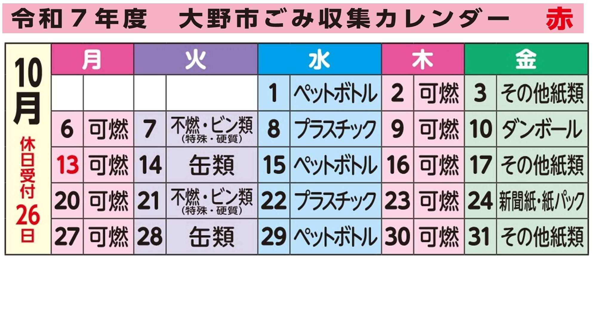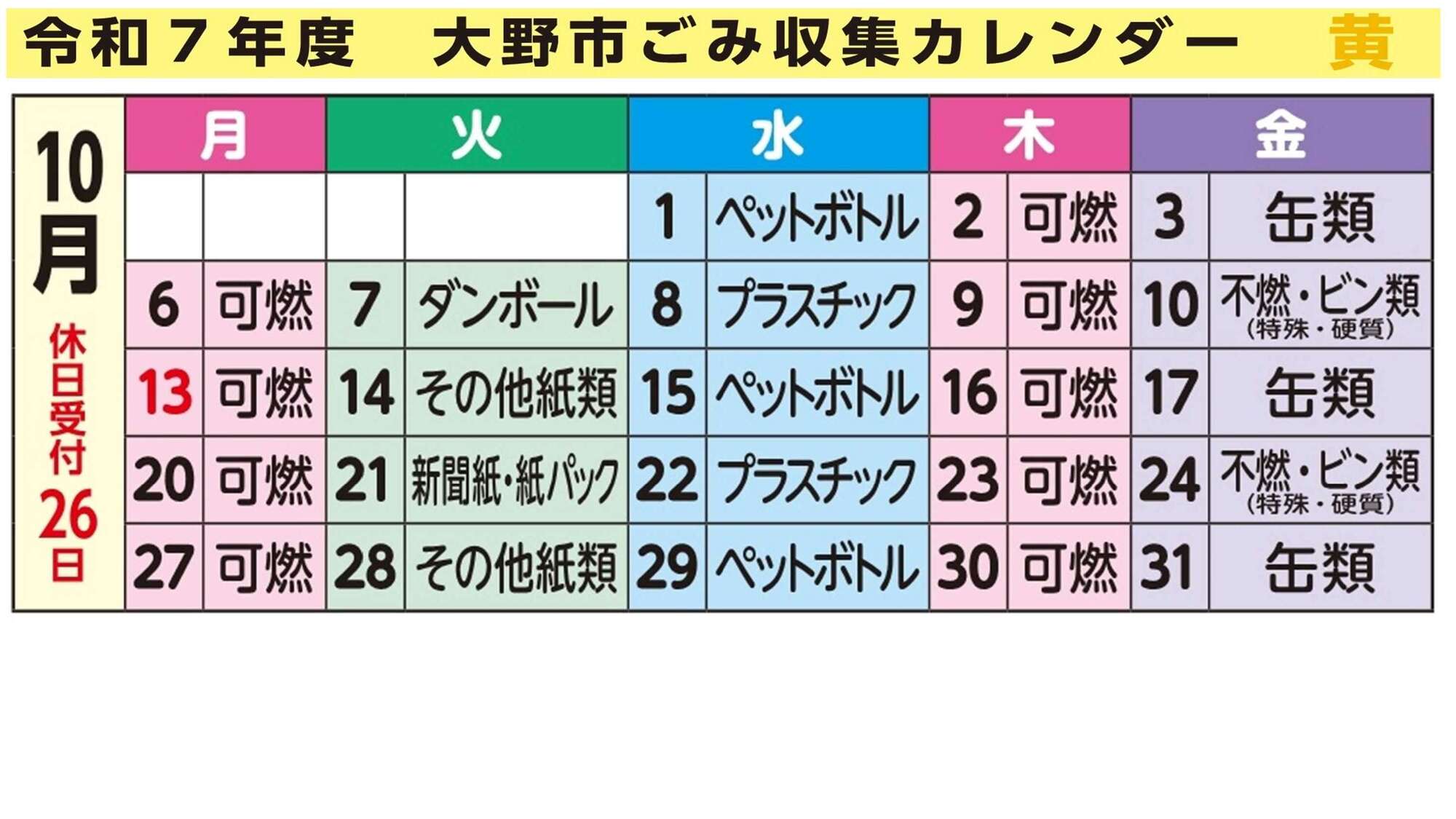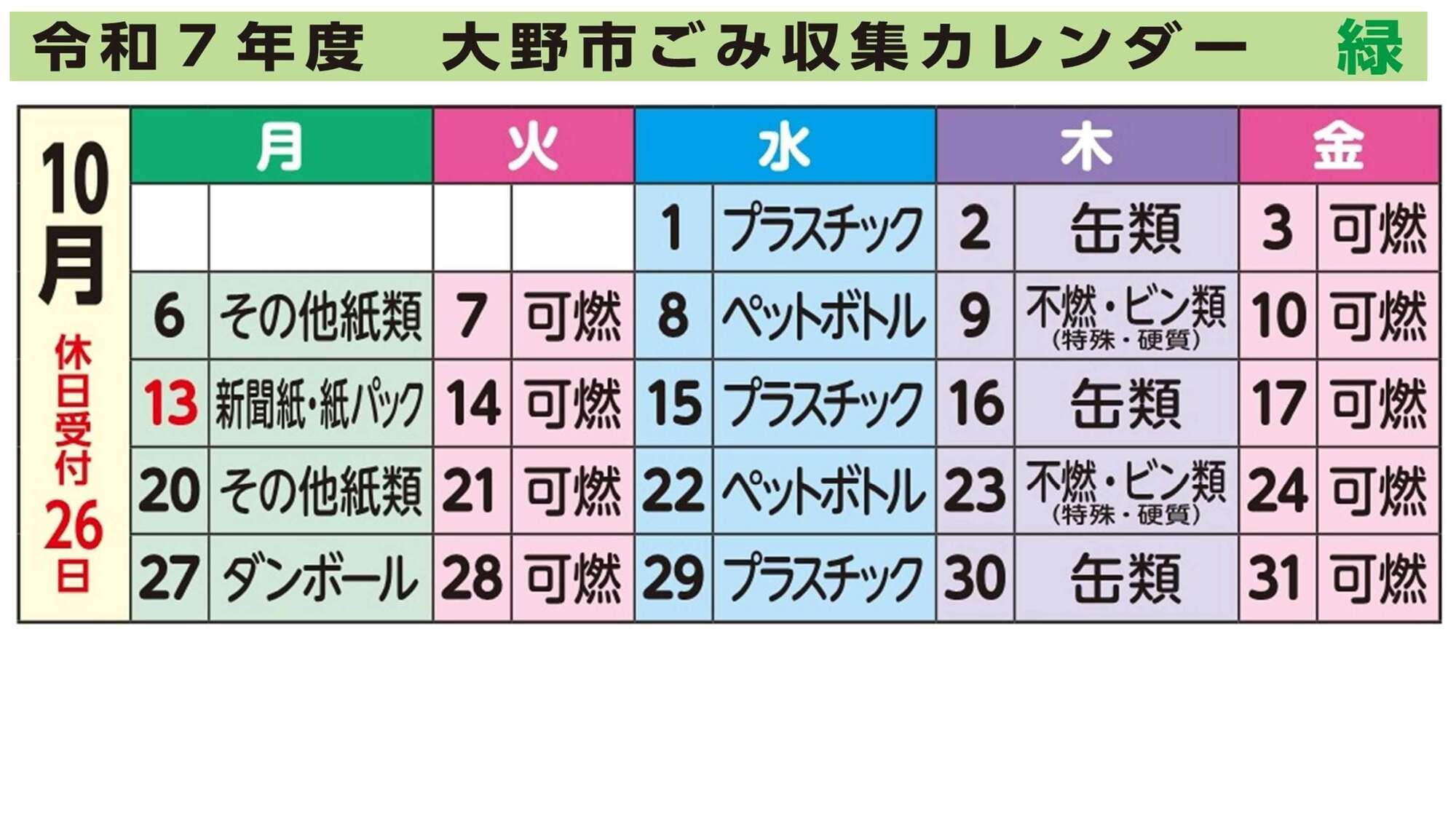令和7年度大野市ごみ収集カレンダー