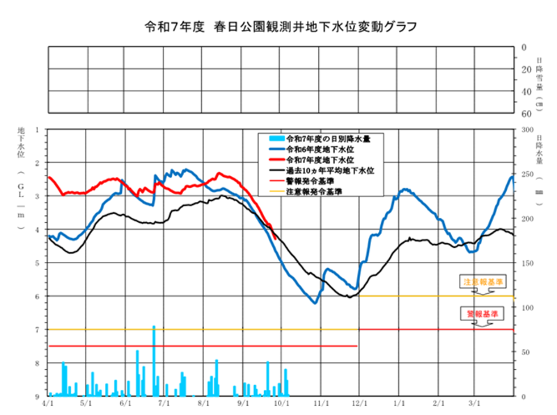 - 春日公園観測井の水位により、地下水注意報・警報を発令することとしています。