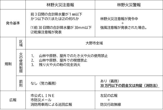 注意報・警報が発令された場合、大野市火災予防条例の規定により、下記の行為が制限されます