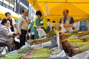 越前おおのの豊かな自然に育まれた農産物や様々な種類の山菜など、春の味覚が並びます。また、山菜てんぷらやそばが好評の山菜茶屋を開設するほか、七間朝市やキッチンカーの出店、越前おおのの友好都市や朝市ゆかりの地域の物産や特産品なども販売されます。