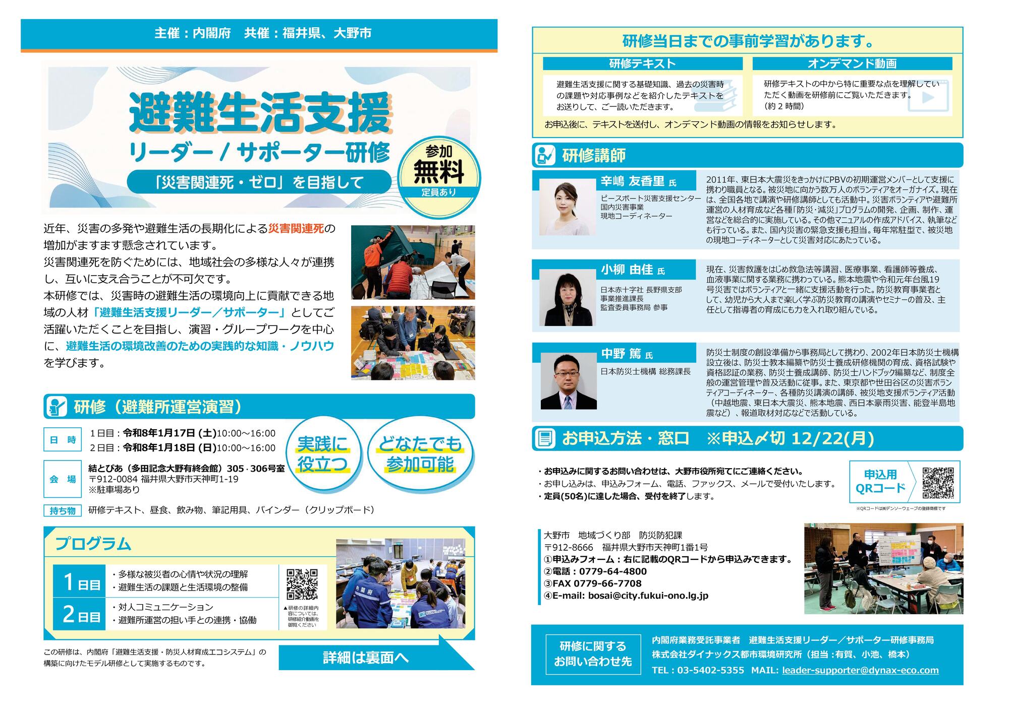 こちら(PDF:1,472KB)のチラシをご確認ください。 - 研修当日までに、テキストの重要な点を解説したオンデマンド動画を視聴いただく必要があります。動画は合計2時間程度です。(インターネット環境が必要です。インターネット環境が整わない場合は個別にご相談ください)