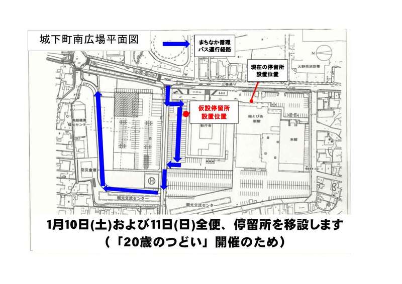 1月10日(土曜日)・11日(日曜日)に開催される『20歳のつどい』に伴い、「大野市役所・結とぴあ」停留所の位置を一時的に変更します。