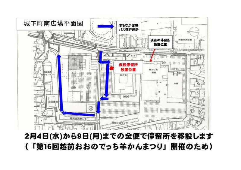 2月4日(水曜日)から2月9日(月曜日)まで、大野市役所・結とぴあ停留所が仮設停留所になります。