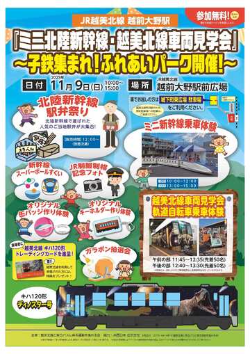 『ミニ北陸新幹線』『越美北線恐竜ラッピング車両の見学会』『全国のおいしい駅弁の販売』などここでしか体験できないイベントが目白押しです!!