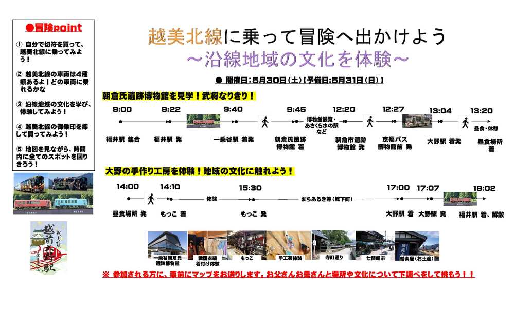 【記載事項】参加者全員の氏名・年齢、住所、連絡先、帰りの降車駅(行きは福井駅からの乗車となります)、親子の写真を添付