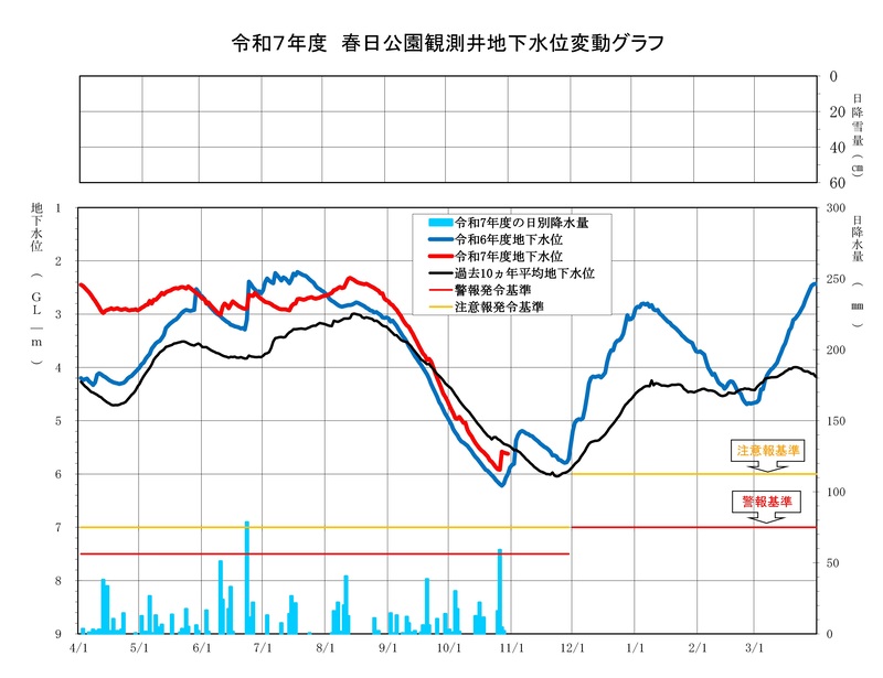 - 春日公園観測井の水位により、地下水注意報・警報を発令することとしています。