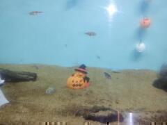 イトヨが泳ぐ大水槽をデコレーションしました。ハロウィン気分でイトヨ観察を楽しめます。写真撮影もできます。