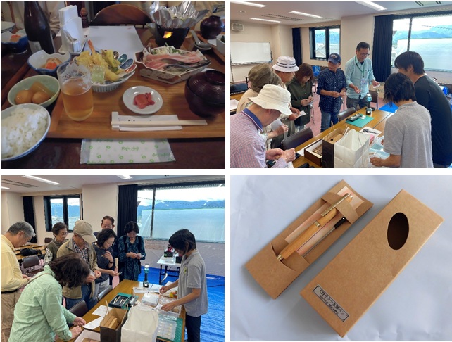昼食の後は4班に分かれて、大野の間伐材を使った木製ボールペン作りの体験や産業と食彩フェアの見学などを楽しみました。木製ボールペンの紙箱には関西大野会のシールが貼られており、いい記念になりました。
